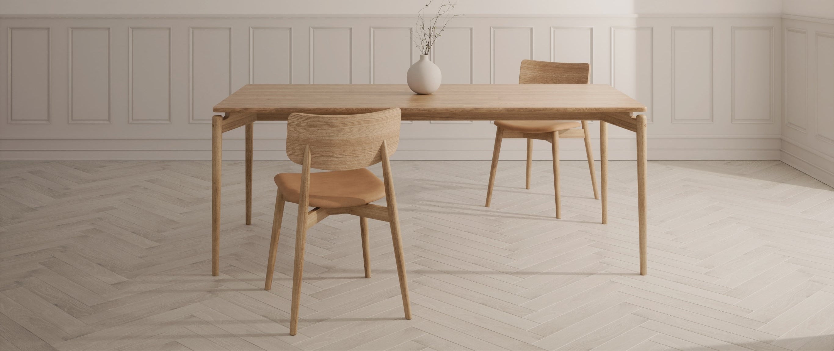We have chosen solid wood for the production of all our tables, as it adds warmth and coziness to your decor. Solid wood possesses a natural beauty and durability that gives your furniture character and timeless elegance. One of the advantages of solid wood is that it can always be sanded and maintained, so your product looks like new, even if it were to sustain damage. With our Bruunmunch care set, you can easily maintain the wood's natural shine and protect it from daily wear and tear, allowing you to enjoy your furniture for many years to come.